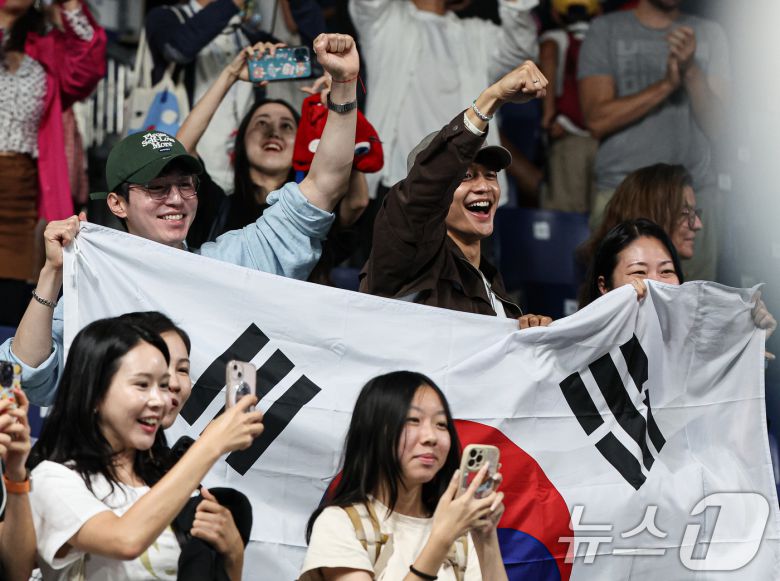 샤이니 민호와 배우 이동욱이 10일(한국시간) 프랑스 파리 사우스 파리 아레나4에서 열린 '2024 파리올림픽' 탁구 여자 단체 동메달 결정전 대한민국과 독일의 경기에서 대한민국이 동메달을 확정 짓자 기뻐하고 있다. 2024.8.10/뉴스1 ⓒ News1 이동해 기자 |