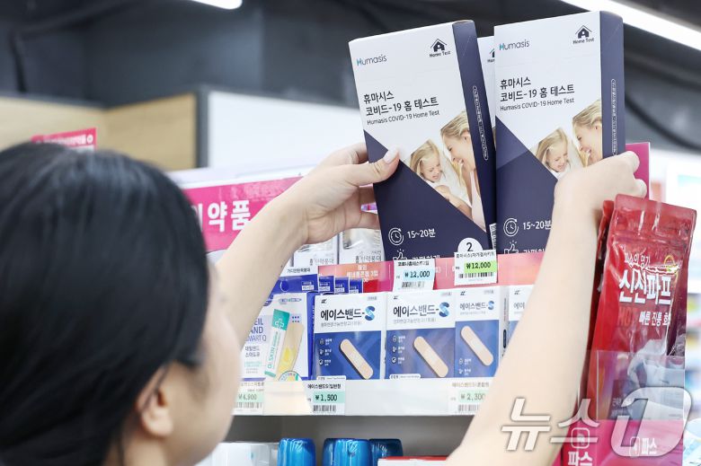 신종 코로나바이러스 감염증(코로나19)이 재유행하면서 주요 편의점의 자가진단키트 매출이 급증하고 있다. 한 편의점에서 직원이 코로나19 자가진단키트를 진열하고 있는 모습. 2024.8.7/뉴스1 ⓒ News1 |