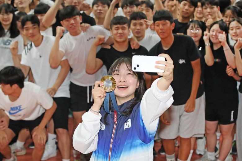 반 선수는 지난달 29일 파리올림픽 사격 여자 10m 공기소총 부문에서 금메달을 따고 이날 모교로 금의환향(錦衣還鄕)했다. 한국의 역대 하계 올림픽 최연소 금메달이면서 100번째 금메달이었다.