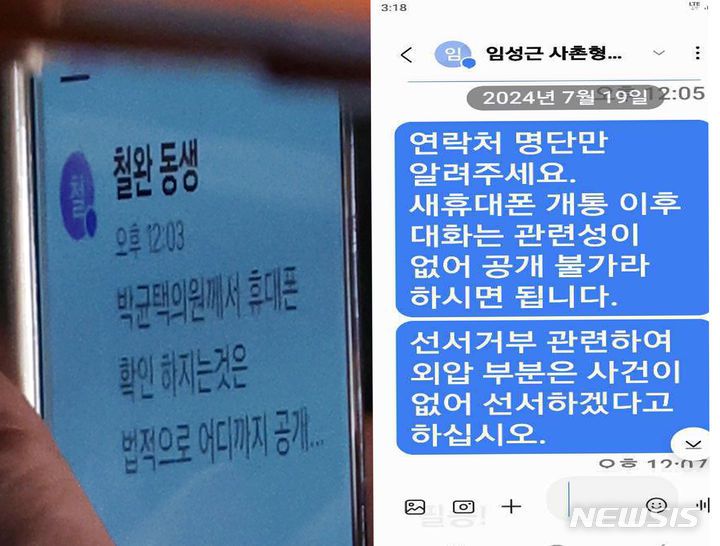[서울=뉴시스] 고승민 기자 = 임성근(왼쪽 사진) 전 해병대 1사단장이 지난달 19일 12시3분 서울 여의도 국회에서 열린 제3차 법제사법위원회 윤석열 대통령 탄핵소추안 즉각 발의 요청에 관한 청원 관련 청문회에서 외사촌 동생인 박철완 광주고검 검사에게 문자를 보내고 있다. 이에 12시5분 박철완(오른쪽 사진) 검사는 "연락처 명단만 알려주세요. 새휴대폰 개통 이후 대화는 관련성이 없어 공개 불가라 하시면 됩니다.", "선서거부 관련하여 외압 부분은 사건이 없어 선서하겠다고 하십시오."라고 답변했다고 언론에 문자 내용을 공개했다. 2024.0719. photo@newsis.com |