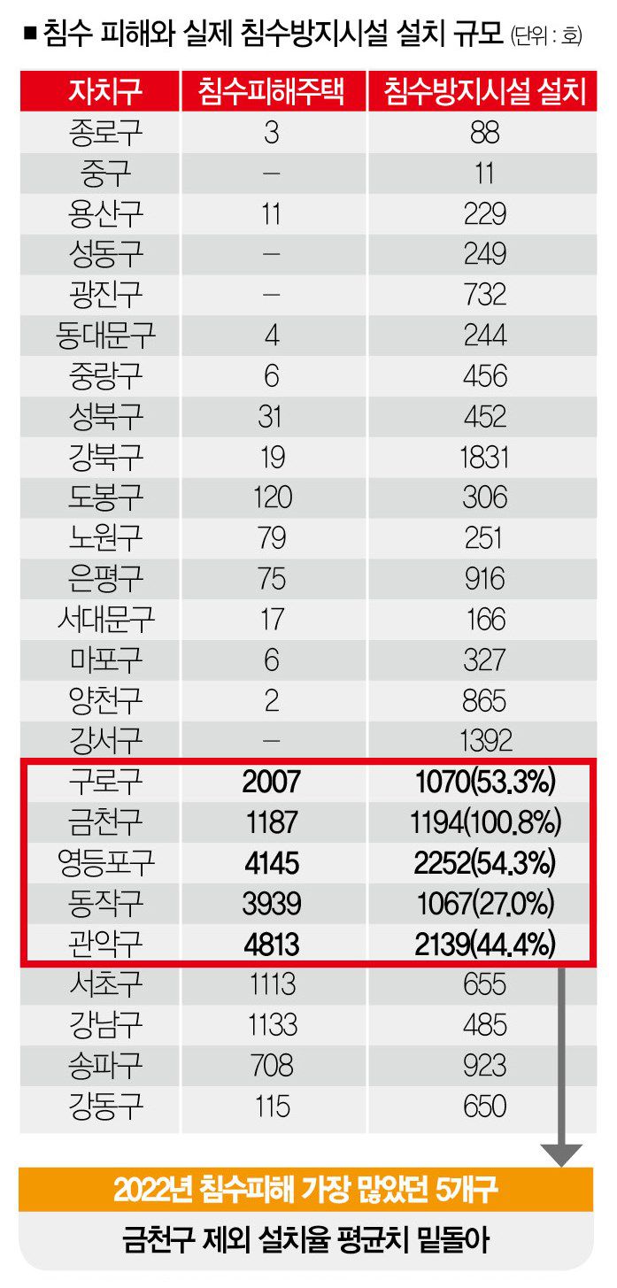 그런데 2022년 가장 많은 집이 잠겼던 서울 내 자치구는 관악구ㆍ영등포구ㆍ동작구의 침수방지시설 설치율은 50%를 밑돈다. 2022년 4813호의 주택이 잠겼던 관악구의 설치율은 44.4%(2139호)에 불과하다.