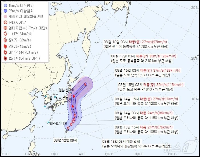 이 태풍은 점차 강도가 강해지면서 북상해 도쿄 앞바다를 스칠 16일쯤엔 최대풍속 시속 133㎞, 강풍반경 최대 370㎞의 강도 '강' 태풍으로 커지겠다.
