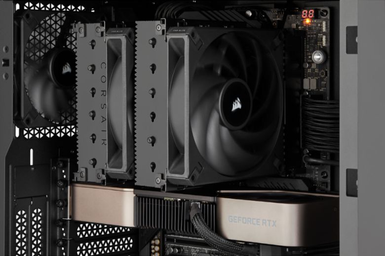 중앙 집중식 공기 흐름을 제공하는 나선형 블레이드가 장착된 에어가이드 기술을 갖춘 커세어 AF140 ELITE 팬이 2개 장착되어 있다. 또한, 유체동력 베어링으로 최대 1,600RPM의 높은 팬 속도에도 소음은 33.9dBA 수준으로 매우 조용하다. 혁신적인 슬라이드 앤 락 팬 마운트 시스템이 도입되어 도구 없이 마운팅 높이를 자유롭게 조절이 가능하다. 팬의 높이를 자유롭게 조절할 수 있어 다양한 메모리 모듈을 장착할 수 있다.