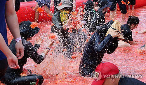 관광객들은 토마토 속에 숨겨진 행운의 숫자를 찾기 위해 토마토를 밟아 으깨고, 스트레스와 함께 머리 위로 날려버리는 등 힐링 축제의 묘미를 만끽했다.