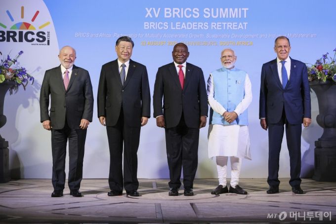 [요하네스버그=AP/뉴시스] 러시아 외무부가 공개한 사진에 22일(현지시각) 남아프리카공화국 요하네스버그에서 열린 제15차 브릭스(BRICS, 브라질·러시아·인도·중국·남아공) 정상회의에 참석한 각국 정상이 기념 촬영을 하고 있다. 왼쪽부터 루이스 이나시우 룰라 다시우바 브라질 대통령, 시진핑 중국 국가주석, 시릴 라마포사 남아공 대통령, 나렌드라 모디 인도 총리, 세르게이 라브로프 러시아 외무장관. 2023.08.23. /사진=민경찬 |