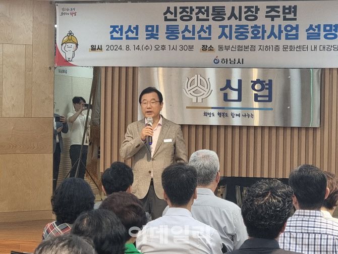 14일 하남 동부신협에서 열린 신장전통시장 주변 전선 및 통신선 지중화사업 설명회에서 이현재 하남시장이 인사말을 하고 있다. 황영민 기자 |