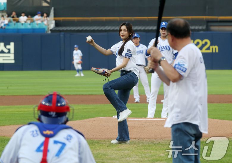 (대구=뉴스1) 공정식 기자 = 14일 오후 대구 삼성라이온즈파크에서 열린 프로야구 '2024 신한 SOL 뱅크 KBO리그' kt 위즈와 삼성 라이온즈의 경기, '삼성 라이온즈와 함께하는 영남이공대학교 day'를 맞아 이재용 영남이공대 총장과 2024 미스코리아 대구 쉬메릭 진(眞) 김태희(영남이공대 호텔·항공서비스 전공)가 시타와 시구를 하고 있다. 2024.8.14/뉴스1