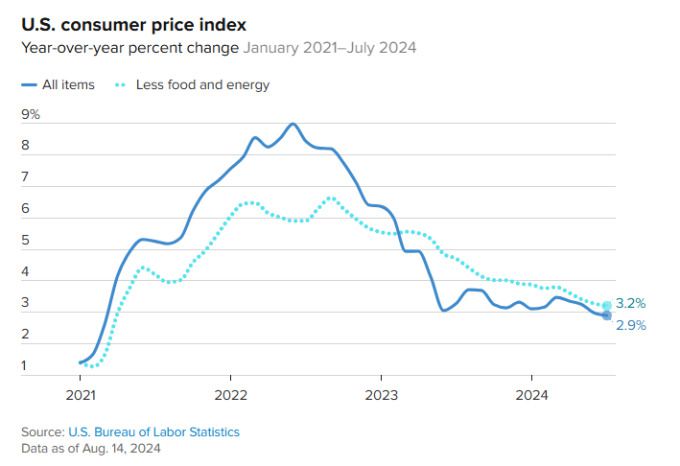 미 노동부는 14일(현지시간) 7월 헤드라인 수치에서 변동성이 큰 식품과 에너지를 제외한 근원 소비자물가지수(CPI)가 전월 대비 0.2% 상승했으며 전년 대비로는 3.2% 올랐다고 밝혔다.