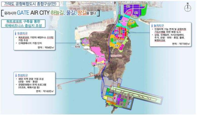 당초 2022년 기본구상 용역에서는 눌차, 두문, 천성, 대항 등 4개 지구 약 900만㎡ 규모로 개발계획을 구상했었다. 눌차지구(447만㎡)는 주거·상업·국제업무 중심의 공항 배후지원기능을 갖춘 복합도시, 천성지구(52만㎡)는 자연경관을 활용한 관광·휴양 거점, 두문지구(92만㎡)는 신재생에너지 산업단지 등이 들어서는 신산업 거점, 대항지구(309만㎡)는 항공복합물류단지로 조성한다는 게 주요 내용이었다.