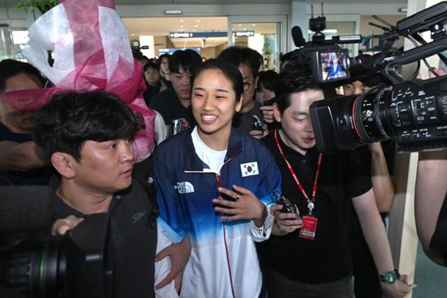 2024 파리올림픽 배드민턴 여자 단식 금메달리스트 안세영이 7일 인천국제공항을 통해 귀국하고 있다. 뉴시스