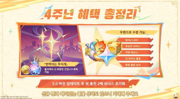 또 5.0버전은 서비스 4주년 시점과 맞물리는 만큼 뒤얽힌 인연' 10개 및 첫 충전 두 배 보너스 등 다양한 혜택과 보상을 제공한다는 방침이다. 뿐만 아니라 이번 버전부터는 최신 메인 스토리(마신 임무)를 완료하면 500원석도 지급한다. 앞으로 개방되는 5.1 및 5.3버전에서의 주요 마신 임무 역시 동일하게 원석을 제공할 예정이다.
