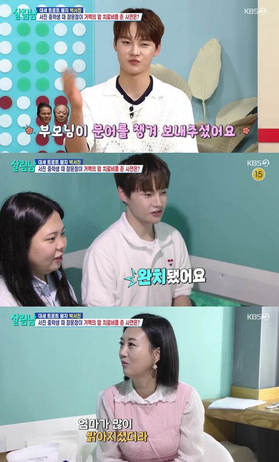 박서진은 "녹화 다음 날 제작진이 계좌번호를 물어보시길래 출연료 주시는 줄 알았는데 누나(장윤정)가 거액의 치료비를 입금해주셨다. 덕분에 엄마 수술도 잘 하고 건강을 회복할 수 있었다"고 전했다.