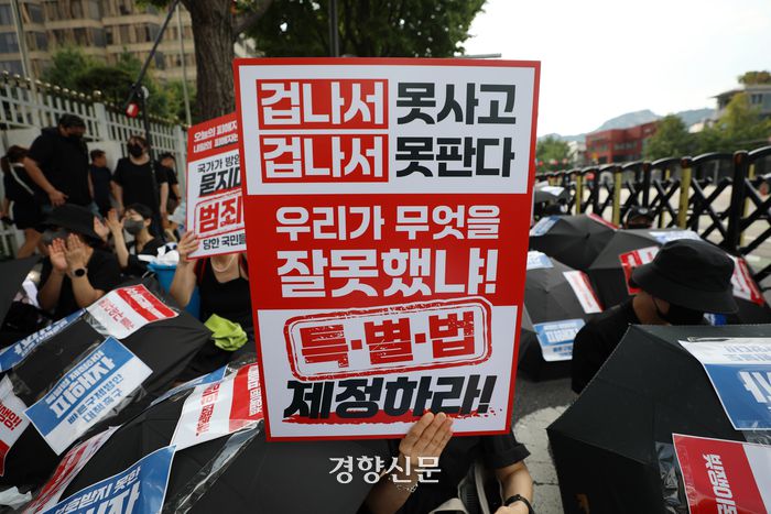 ‘티메프 사태’ 피해자들이 18일 서울 종로구 정부서울청사 앞에서 열린 검은우산 집회에서 피해자 구제를 촉구하는 손팻말을 들고 있다. 이날 참가자들은 정부에 실효성 있는 구제방안 마련과 특별법 제정을 촉구했다. 권도현 기자 |