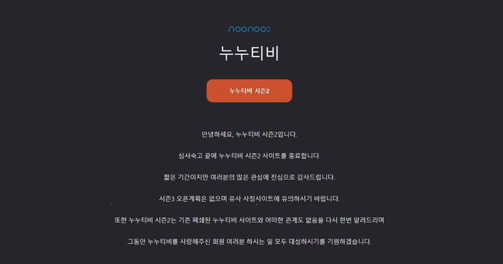 [서울=뉴시스] 누누티비 시즌2는 "심사숙고 끝에 누누티비 시즌2 사이트를 종료한다"며 서비스 긴급 종료 소식을 알렸다. (사진=누누티비 시즌2 웹사이트 캡처) *재판매 및 DB 금지