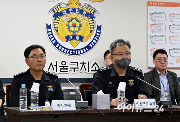 ![김문태 서울구치소장과 조영기 출정과장(왼쪽)이 19일 오전 경기도 의왕시 서울구치소에서 진행된 국회 법제사법위원회 서울구치소 현장검증에 참석하고 있다. [사진=국회사진취재단]](https://thumb.zumst.com/780x0/https://static.news.zumst.com/images/126/2024/08/19/fbb1f81e32074afaab513e13befc18c4.jpg) |