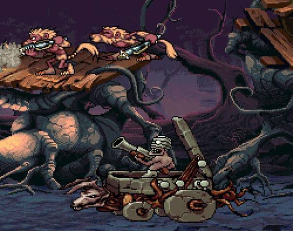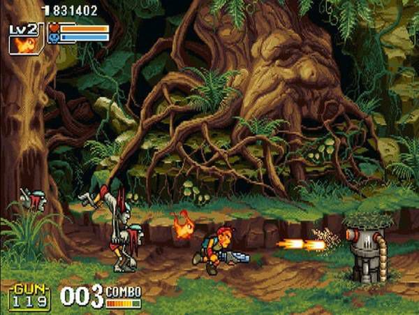 조기자: 맞습니다. '메탈슬러그'와 같은 런앤건 방식에, 적들의 패턴이나 혹은 기계가 융합된 기믹들, 그리고 공격 방식의 경쾌함 등 많은 부분에서 비슷하죠. 그래픽을 리뉴얼하고 새로운 느낌을 준 '메탈슬러그' 아류작이라고나 할까요. 그 '던전앤드래곤'을 삼국지로 탈바꿈 시킨 게임도 있고.. 여튼 여러 면에서 표절 느낌이 있긴 하지만 표절은 아닙니다. 재미도 있고 퀄리티도 높아요. 상당히 공들인 아류작이라고 표현해야할 것 같습니다.