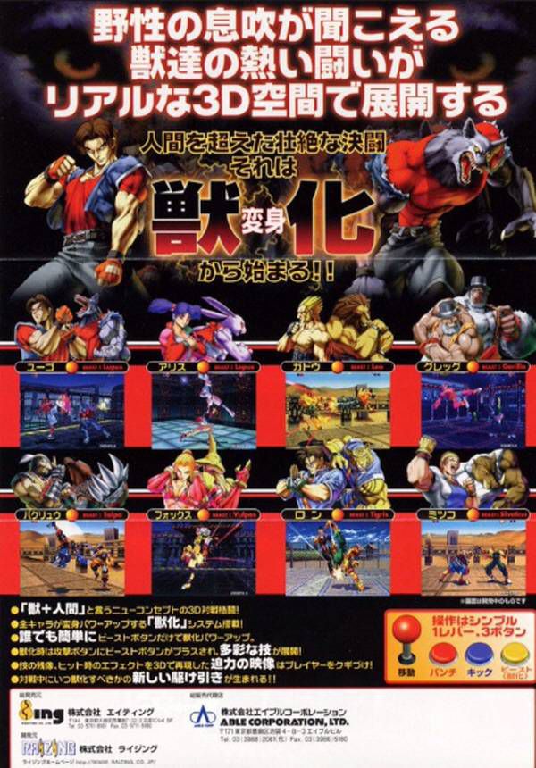 전반적인 컨셉은 당시 유행하던 버파나 철권처럼 전형적인 3D격투에 파이팅 바이퍼즈처럼 케이즈를 도입했는데, 모든 캐릭터가 자기만의 수인으로 변신할 수 있는 시스템이 상당히 매력있게 다가왔습니다.