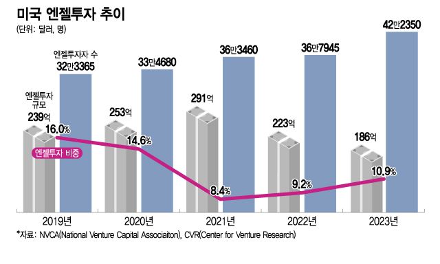 19일 NVCA(미국 벤처캐피탈협회)에 따르면 2023년 미국의 벤처투자 규모는 총 1706억달러로 전년대비 29.6% 급감했다. 길어지는 글로벌 고금리 기조에 벤처투자 혹한기가 지속되면서 위축됐다. 엔젤투자도 예외는 아니었다. 그러나 감소폭은 훨씬 적었다. 미국 뉴햄프셔대학이 발간하는 CVR(Center for Venture Research) 보고서에 따르면 2023년 미국 엔젤투자 규모는 186억달러다. 전년 대비 16.4% 감소하는데 그쳤다. 초기 스타트업의 든든한 자금줄 역할을 하고 있다.