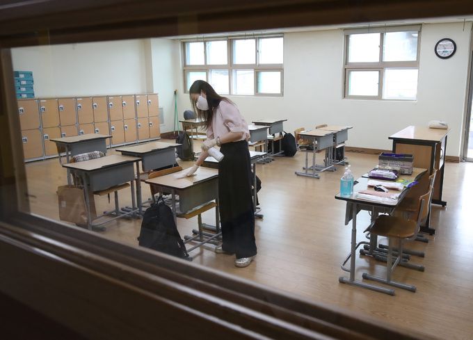 신종 코로나 바이러스 감염증(코로나19)이 재확산 조짐을 보이자 지난 20일 대전의 한 고등학교에서 교사들이 교실 소독을 하고 있다. 대전=뉴스1 |