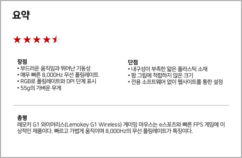 레모키 G1 와이어리스(Lemokey G1 Wireless)는 키크론의 서브 브랜드인 레모키 제품이지만, 키트론 메인 제품군에 속하는 마우스만큼 뛰어난 게이밍 마우스다. 초경량 대칭형 디자인, 그립감이 좋은 섀시, 매우 부드러운 움직임이 결합돼 뛰어난 핸들링을 제공한다.
