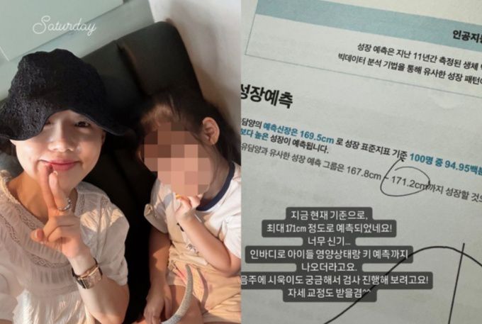 이어 “그러다 동네에 아이들 성장 운동 센터가 생겨서 가 봤다”며 “병원에서 채혈검사를 통해 확인할 수 있는 성장예측검사를 인바디를 통해 간단히 받았다. 유담이는 현재 기준으로 키가 171cm 정도까지 크는 걸로 나왔다. 너무 신기하다”고 밝혔다.