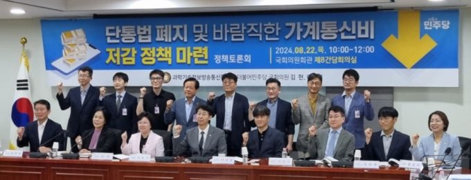 22일 서울 영등포구 여의도 국회의원회관에서 김현·이훈기 더불어민주당 의원 주최로 열린 '단통법 폐지 및 바람직한 가계통신비 저감 정책 마련' 정책토론회에서 참석자들이 기념촬영을 하고 있다. /사진=배한님 기자