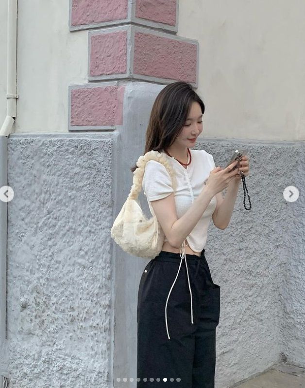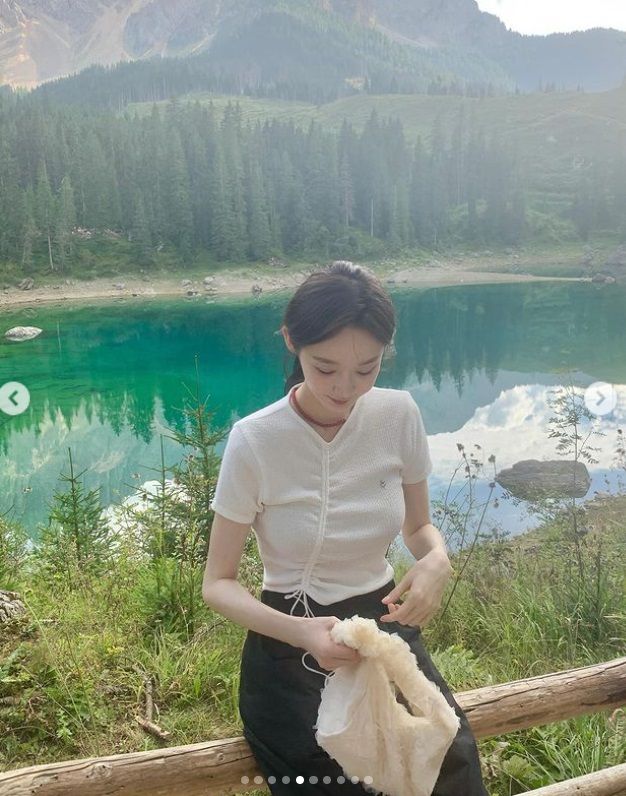 공개된 사진 속 강민경은 여행지에서 휴양을 즐기는 모습. 흰색 반팔 상의와 검은색 바지를 매치하며 캐주얼한 스타일링을 선보인 그는 호수 등을 배경으로 포즈를 취하며 청순한 분위기를 자랑해 시선을 모은다.