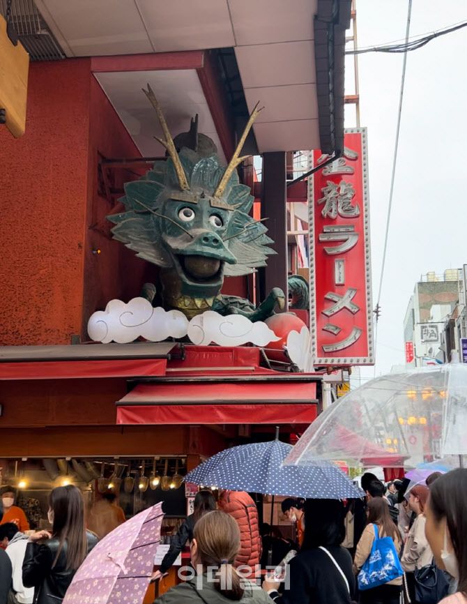 일본 오사카 ‘킨류라멘’ 도톤보리점의 용 조형물.(사진=양지윤 기자) |