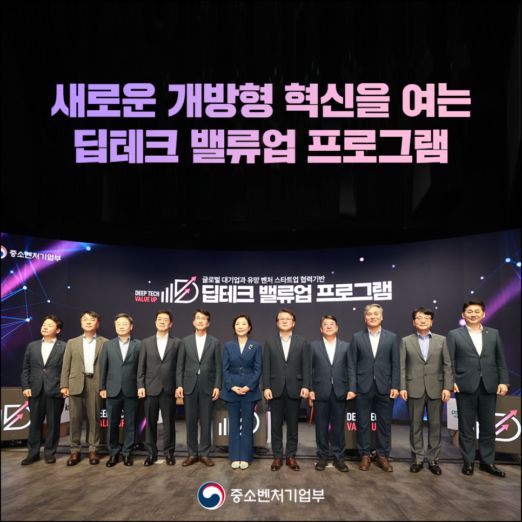 중소벤처기업부(장관 오영주, 이하 중기부)는 지난 21일 서울 코엑스에서 주요 대기업(8곳)과 스타트업, 지원기관 관계자 등 100여 명이 모인 가운데, 다양한 지원 수단을 통한 성과 창출(Hybrid tools & Outcome) 중심의 새로운 개방형 혁신 프로그램인 ‘딥테크 밸류업(Deep Tech Value-Up) 프로그램’의 시작을 알리는 자리를 가졌다.