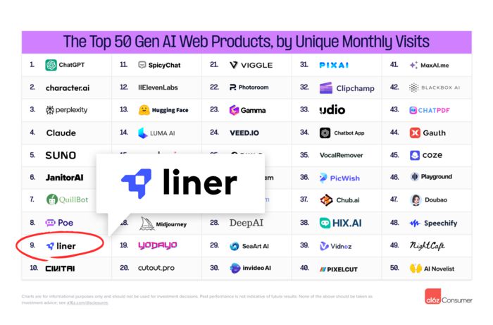 글로벌 인공지능(AI) 검색 엔진 라이너가 세계 최대 벤처캐피털(VC)이 선정한 글로벌 생성형 AI 서비스 인기 순위에서 9위를 차지했다.