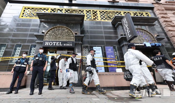 [부천=뉴시스] 전진환 기자 = 국과수와 경찰, 소방 등 관계자들이 23일 오전 화재로 19명의 사상자가 발생한 경기 부천 호텔에서 최초로 불이 난 곳으로 확인된 객실 현장 감식을 마치고 나오고 있다. 2024.08.23. amin2@newsis.com |
