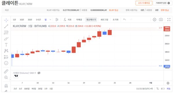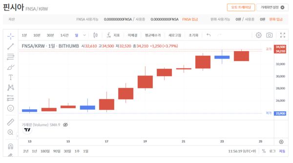 토종코인들의 약진도 두드러졌다. 카카오 자회사 그라운드엑스가 발행 한 클레이는 전주 동시간 대비 32.96% 상승한 개당 238원에 거래됐다. 네이버 관계사 라인이 발행한 핀시아도 전주 동시간 대비 39.95% 상승한 개당 3만4400원에 거래됐다. 클레이와 핀시아 모두 1주일만에 30% 넘게 급등한 것.