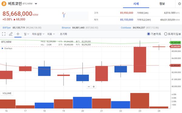 가상자산 거래소 업비트에 따르면 24일 오전 8시 기준 비트코인 전즈 동시간 대비 4.16% 상승한 개당 8574만6000원에 거래됐다. 이번주 초 비트코인 가격은 8100만원대 내외를 등락하며 약세를 보였다. 미국의 경기침체 우려, 중동전쟁 악화, 일본의 금리인상 등 각종 악재가 지속적으로 비트코인 가격에 영향을 준 것.