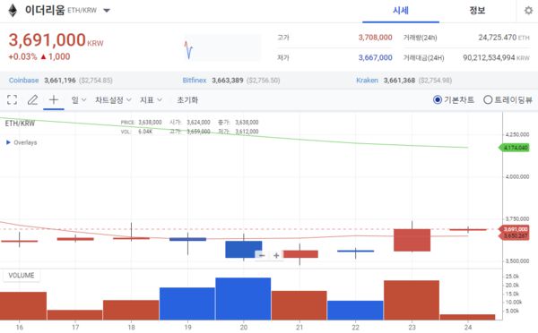 반면 이더리움은 유의미한 가격변화를 보이지 않았다. 이더리움은 전주 동시간 대비 1.84% 상승한 개당 369만4000원에 거래됐다. 업계선 이더리움 트랜잭션 수수료(가스비) 급락이 이더리움 가격 상승을 저해하고 이다는 분석이 나온다. 실제로 이더리움 가스비는 5년 만에 최저치를 기록했다. 가스비가 낮아지면 이더리움 공급량이 증가하기 때문에 이더리움 가격에 영향을 미칠 수 있다는 설명이다.