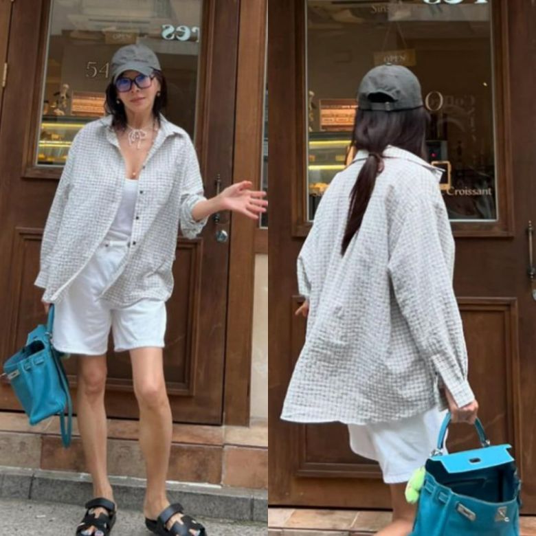 사진 속에서 황신혜는 해외 명품 브랜드 H사의 블랙 샌들에 화이트 반바지와 무채색 모자 그리고 셔츠를 매치해 캐주얼한 룩을 선보였다.