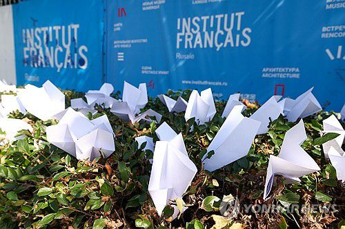 주러시아 프랑스대사관에 놓인 두로프 체포에 항의하는 종이비행기 |