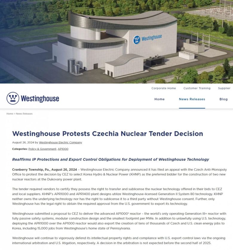 웨스팅하우스는 체코 원전 건설 사업을 수주를 놓고 한수원을 비롯해 프랑스전력공사(EDF)와 경쟁했으나 탈락했다. 체코 정부는 지난달 17일 한수원을 우선협상대상자로 선정한 바 있다.
