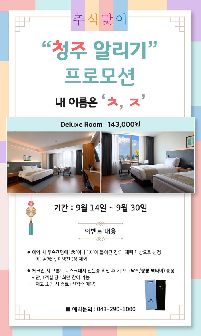 충북 지역의 유일한 5성급 호텔인 그랜드플라자 청주가 추석 연휴를 앞두고 이색 프로모션 ‘내 이름은 ㅊㅈ’를 진행한다고 26일 밝혔다.