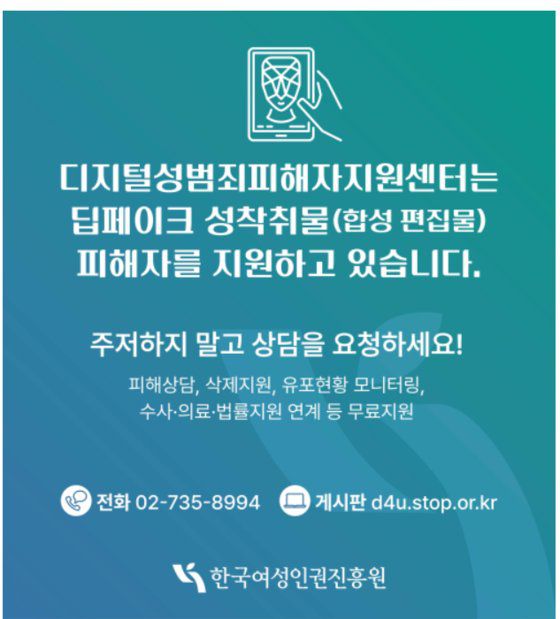 여성가족부가 운영하는 디성센터에선 상담을 하고 추후 모니터링도 할 수 있다. 피해 합성물 삭제나 유포 현황을 모니터링하고 싶은 경우 ▶피해 합성물의 구체적인 주소(URL) ▶영상·사진 형태의 피해 합성물 ▶게시글 제목과 내용 등을 미리 확보해야한다. 피해 지원 상담은 365일 24시간 운영하는 상담 전화(02-735-8994)나 온라인게시판(d4u.stop.or.kr)을 통해 신청하면 된다. 여성긴급전화(1366)를 통해서도 상담이 가능하다.