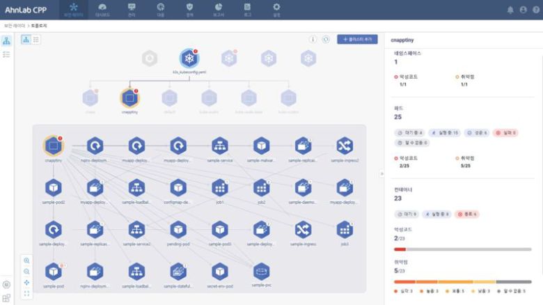 이와 함께 컨테이너 자산 구성 현황과 컨테이너 이미지 검사 결과를 도식화한 ‘자산 토폴로지 뷰’를 제공한다. 조직 보안 담당자는 자산 토폴로지 뷰를 활용해 복잡한 자산 현황에 대한 전체적인 가시성을 확보할 수 있다. 자산 토폴로지 뷰는 이미지 검사로 탐지한 취약점의 자산별 배포 현황도 다이어그램 형태로 제공해 조직 보안 담당자의 효율적인 위협 대응을 지원한다. 또한 ‘안랩 컨테이너 시큐리티’는 안랩 CPP의 플러그인 형태로 제공되기 때문에 ‘안랩 CPP’의 단일 관리화면으로 손쉽게 운영이 가능하다.
