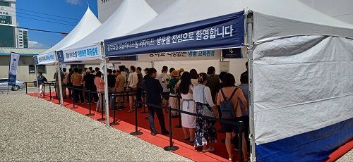 실제 견본주택 앞은 무더운 날씨에도 불구하고 입장을 기다리는 방문객들로 긴 대기행렬이 이어졌고, 내부에 마련된 상담석은 남녀노소 다양한 연령층의 상담객들로 가득 찼다. 모형도와 유니트 앞 역시 관람객들로 문전성시를 이루는 모습이다.