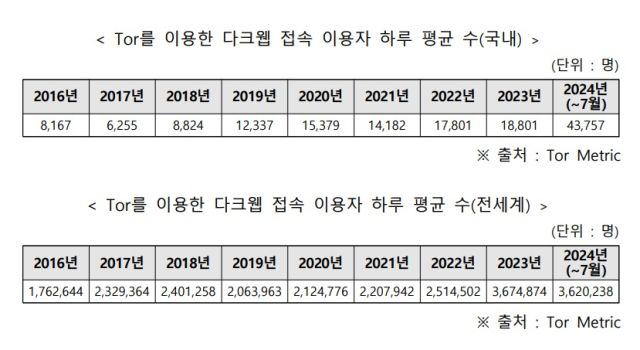 [김보민기자] 다크웹에 접속한 국내 이용자 수가 올해 역대 최고치를 기록했다는 조사 결과가 나왔습니다. 국회 과학기술정보방송통신위원회 소속 국민의힘 박충권 의원이 한국인터넷진흥원(KISA)으로부터 받은 자료에 따르면, 올 7월까지 다크웹 접속 프로그램 '토르'의 하루 평균 국내 이용자 수는 4만3757명입니다. 8~12월 이용자 수를 포함하게 되면 규모는 더욱 커질 전망입니다.