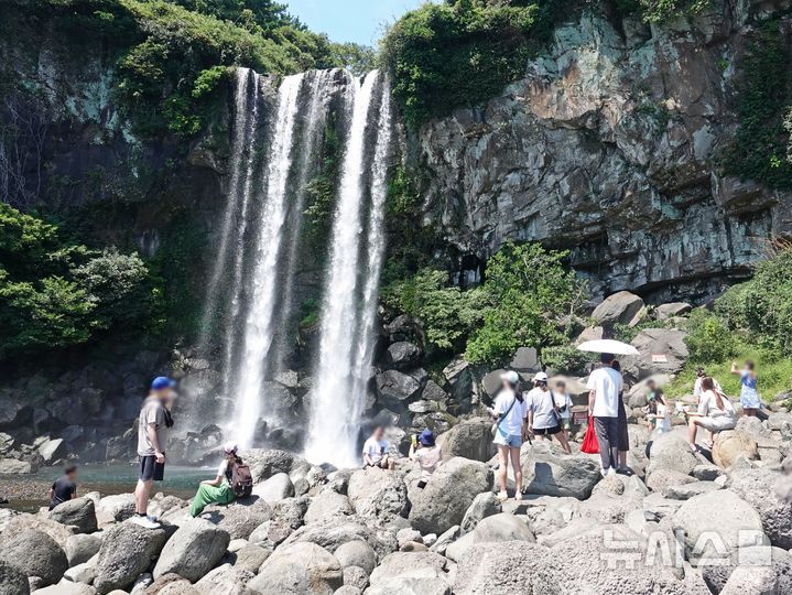 [제주=뉴시스] 오영재 기자 = 낮 기온 31도를 웃도는 1일 오후 제주 서귀포시 동홍동 정방폭포에서 방문객들이 높이 23m의 물줄기를 구경하고 있다. 2024.09.01. oyj4343@newsis.com
