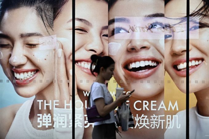 29일 중국 베이징에서 한 여성이 휴대폰을 보면서 쇼핑몰 앞을 지나가고 있다./AFPBBNews=뉴스1