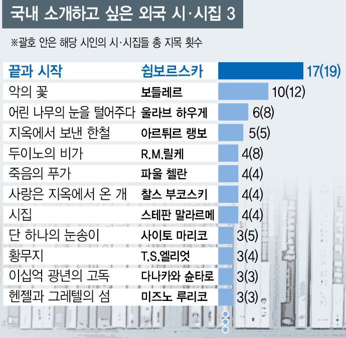 당대 시인들의 외국 시로는 비스와바 쉼보르스카(심보르스카)의 것이 독보적이다. ‘소개하고 싶은 외국 시(집) 3’에 110편·종 가까이 추려진 가운데, ‘끝과 시작’(17표), ‘검은 노래’, 유고시집 ‘충분하다’(이상 1표씩) 등 국내 출간된 시집 전부를 아울러 총 19명이 쉼보르스카의 작품(특정 시 수록 시집 포함)을 추천했다. “힘겨운 나날들, 무엇 때문에 너는/ 쓸데없는 불안으로 두려워하는가./ 너는 존재한다 - 그러므로 사라질 것이다/ 너는 사라진다 - 그러므로 아름답다”(‘두 번은 없다’)고 위로하며 노벨 문학상(1996)을 받은 여성 시인이다. 샤를 보들레르는 ‘악의 꽃’(10표), 산문시집 ‘파리의 우울’(2표)로, 울라브 하우게(올라브 헤우게)는 ‘어린 나무의 눈을 털어주다’(6표), ‘내게 진실의 전부를 주지 마세요’(2표)로 다음 많이 호명됐다. ‘두이노의 비가’ 등의 라이너 마리아 릴케(총 8표), ‘스무 편의 사랑의 시와 한 편의 절망의 노래’ 등의 파블로 네루다(칠레), ‘절망이 벤치에 앉아 있다’ 등의 자크 프레베르(프랑스, 이상 6표), ‘지옥에서 보낸 한 철’의 아르튀르 랭보, ‘단 하나의 눈송이’ 등의 사이토 마리코(이상 5표)가 뒤를 이었다. 일본 시인 미즈노 루리코(‘헨젤과 그레텔의 섬’), 다니카와 슌타로(‘이십억 광년의 고독’) 등이 3표씩 받으며 주목을 받은 반면, 페르난두 페소아와 앤 카슨 등은 2표에 그쳤다.