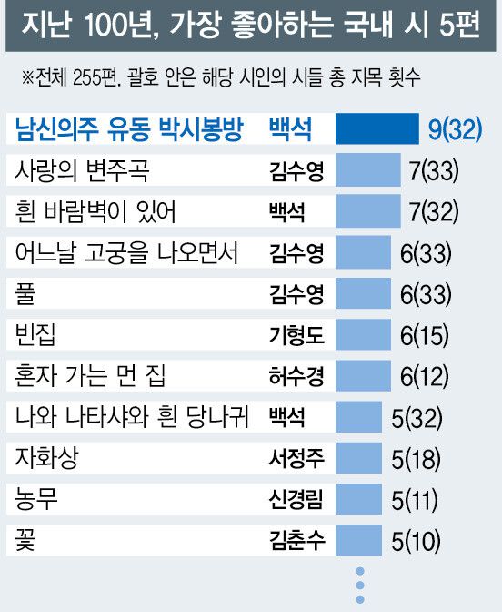 ‘최애 시 목록’에 가장 많은 시를 배출한 이는 14편의 김수영(총 33표), 11편 김종삼(총 18표), 10편의 서정주(총 18표) 순이다. 2000년 등단한 한 시인은 김수영의 ‘사랑의 변주곡’을 꼽으며 “수영의 시는 이상적인 시민이라기보다 욕망을 가진 존재로서의 현실적인 시민상을 처음으로 보여주었다”고 평가했다. 현역 중엔 이성복(9편·10표), 황지우(5편·5표)에 이어 4편씩의 김혜순(5표)·신해욱(4표), 3편씩의 김행숙·백무산·심보선·오규원·이수명·이장욱·이제니·장석남·진은영 시가 많이 들었다.