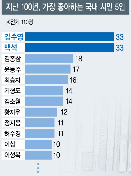 ‘남의 김수영, 북의 백석’은 ‘가장 좋아하는 시인 5명’을 묻는 항목에서도 확인된다. 나란히 33표로 1위를 차지했고, 김종삼(18표), 윤동주(17표), 최승자(16표), 기형도·김소월(14표), 정지용·허수경(11표)이 뒤따랐다. 단독적 시 세계에 더불어, 시의 사회성, 시인의 삶을 평가한 응답자들이 많았다. 한 시인은 윤동주-정지용-백석-김수영-신경림을 차례로 꼽아 “시상이 떠오르지 않을 때 꺼내 경전처럼 꺼내 읽는 시인들”이라며 “시도 좋지만 이 시인들의 삶을 대하는 태도를 선호하는 편”이라고 말했다. “시만 아름다운 것이 아니라, 그 삶도 떳떳했다”며 김소월-정지용-윤동주-신경림-허수경을 솎은 또 다른 시인도 이유는 비슷하다. 남성 대세에서 최승자·허수경의 족적이 또렷하다. 전체 거명된 110명 가운데, 12표의 황지우가 현역으론 으뜸. 이성복(10표), 김혜순(7표), 장석남(5표)이 뒤를 이었다. 이편의 김혜순과 황지우는, 저편의 허수경·서정주와 함께, 시인들이 ‘가장 좋아하는 시집 3권’ 목록(전체 118종)에 각기 4종씩 꼽혀 가장 많았다.
