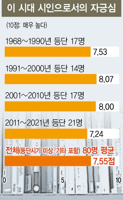 그럼에도, 당대 시인들의 ‘시인으로서의 자긍심’(0~10점)은 높은 편이다. 10점 만점에 평균 7.55점. 등단 시기를 밝힌 이들만 보면, 1990년 이전 등단자(17명) 7.53점, 1991~2000년(14명) 8.07점, 2001~2010년(17명) 8.0점, 2011~2021년(21명) 7.24점이었다. 세대를 아울러 전체 58명이 7점 이상을 부여했다.
