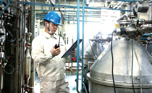 DS단석 관계자가 바이오연료 생산공정을 살피고 있다. /DS단석