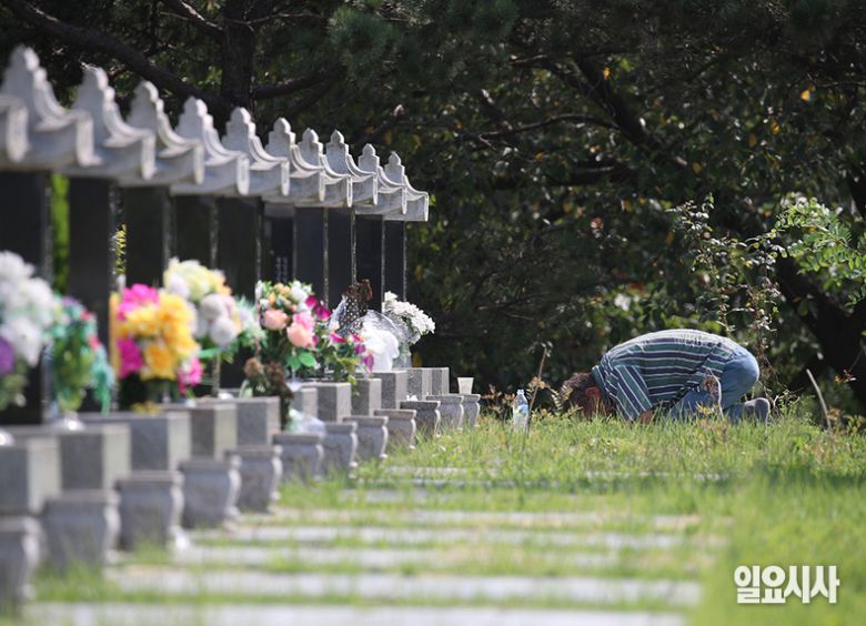 추석 연휴를 앞두고 있는 3일 오후 인천 부평구 인천가족공원을 찾은 한 성묘객이 성묘를 하고 있다.